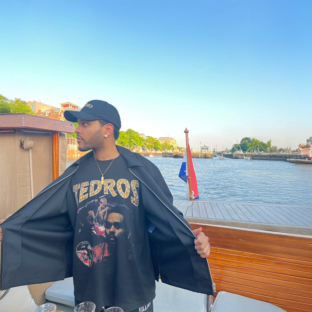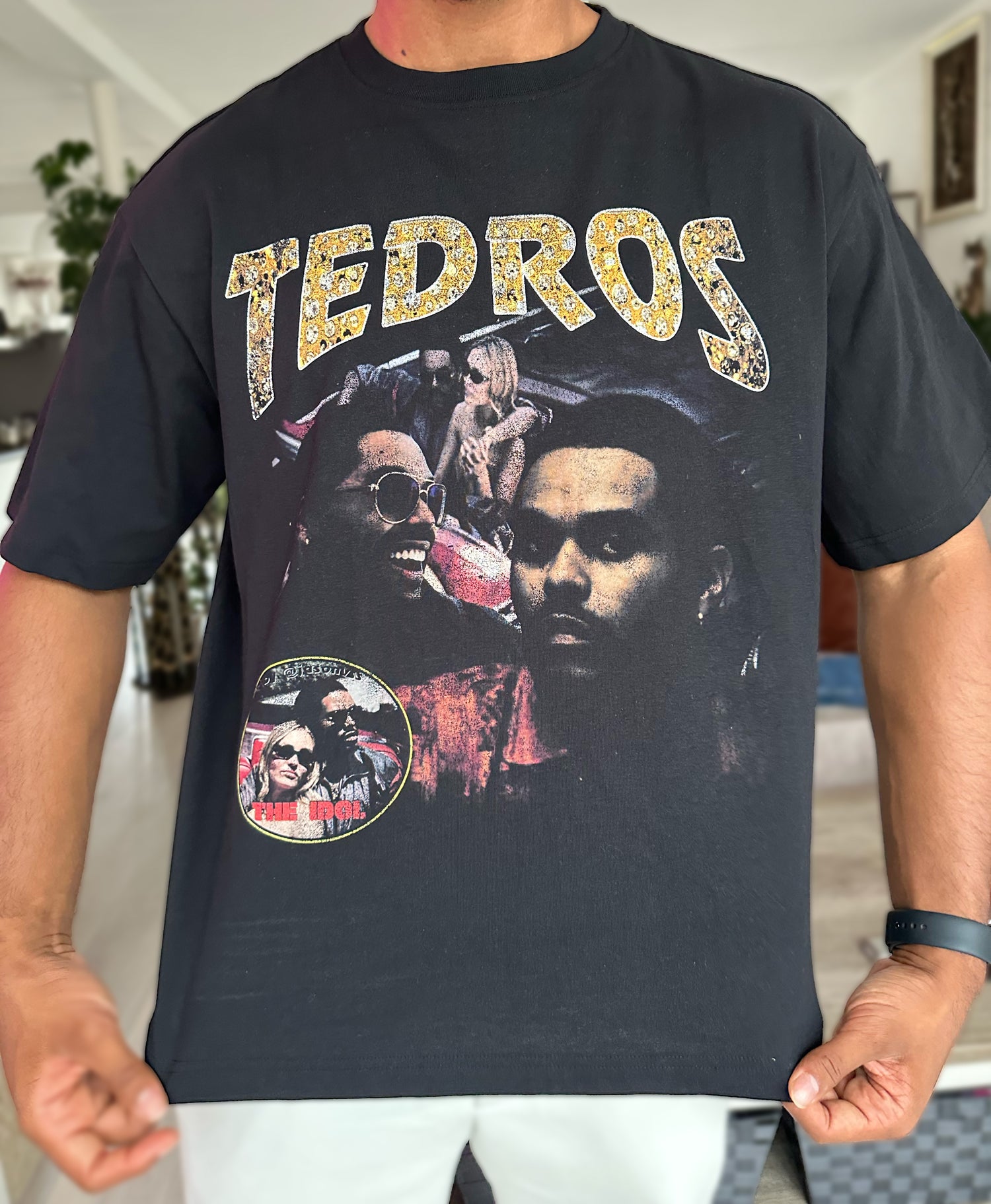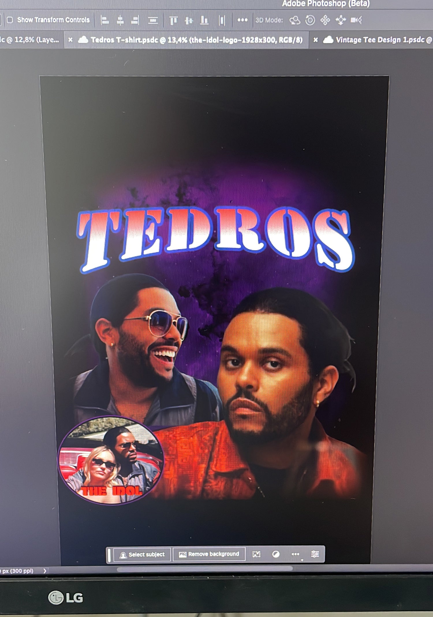 The concept was clear from the start: a vintage bootleg T-shirt for The Weeknd, inspired by his character Tedros from HBO’s The Idol. I initially tried using HBO’s signature color scheme, but it just wasn’t working. Still, the two front images looked great, so I decided to keep those and experiment with the background and the main Tedros text.